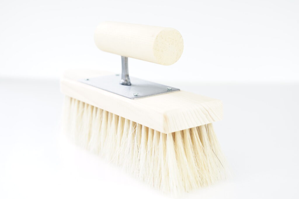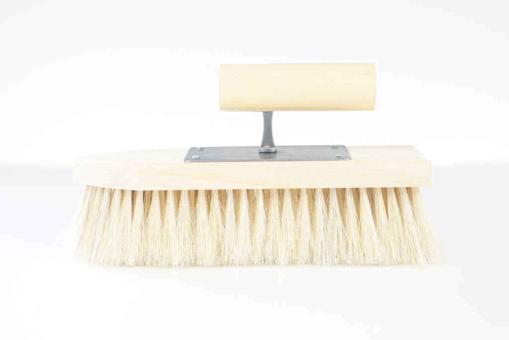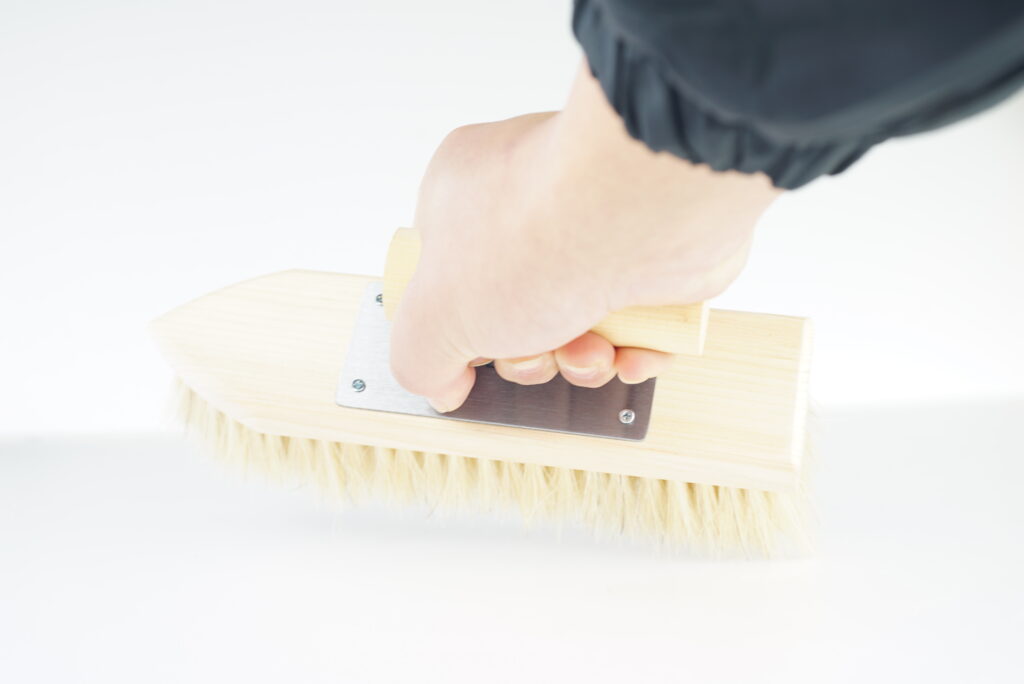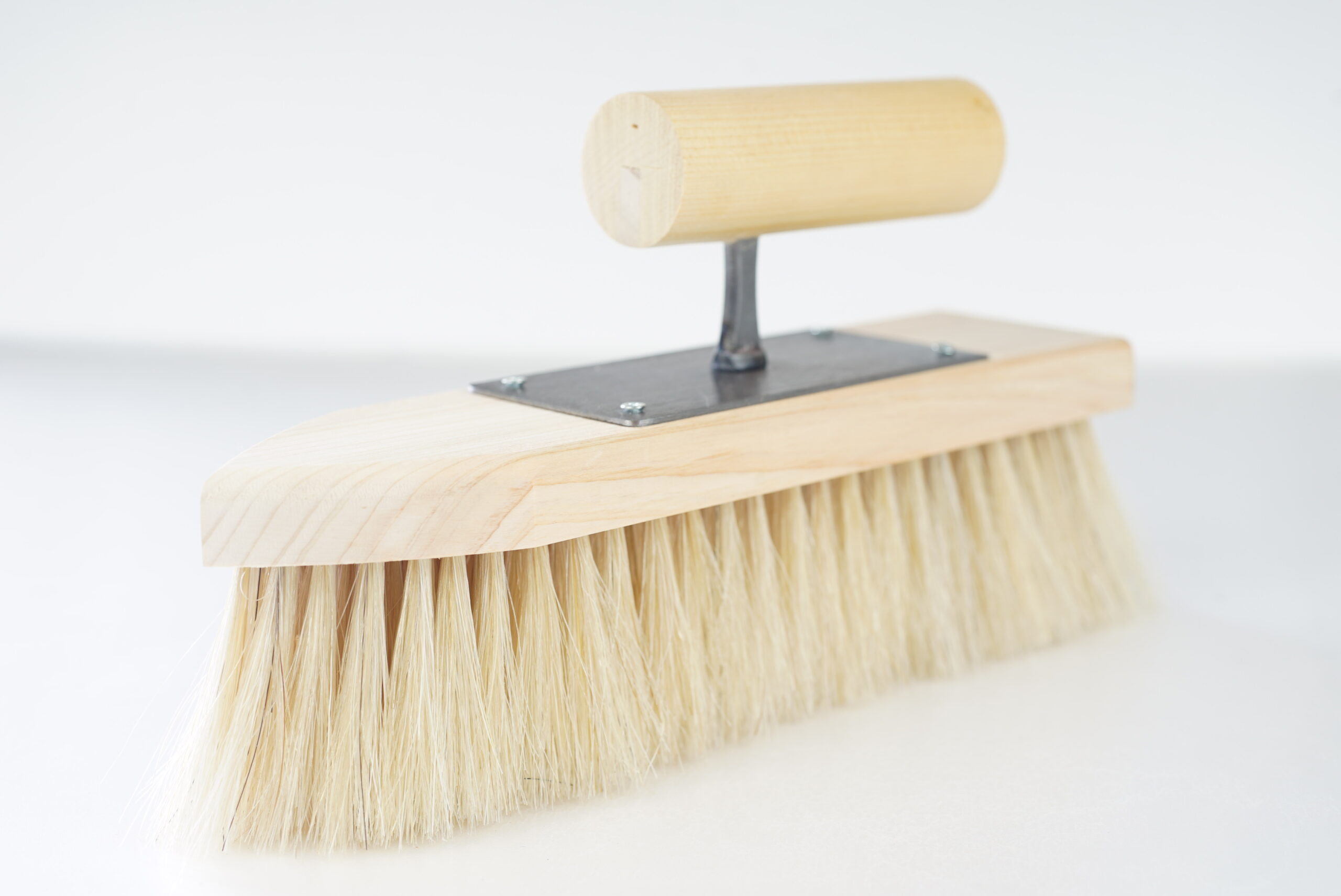 洗い出し仕上げや土間仕上げ時の水引き工程に適した、純馬毛(白毛)製の左官刷毛です。