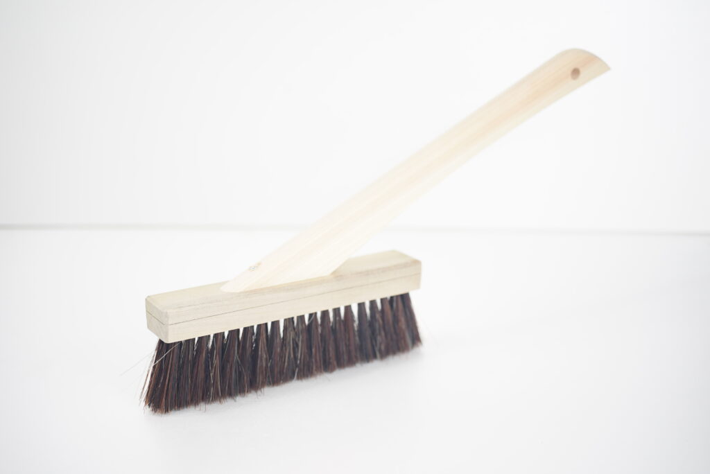 モルタルや土間仕上げ時の水引き工程に適した混毛タイプの左官ブラシです。