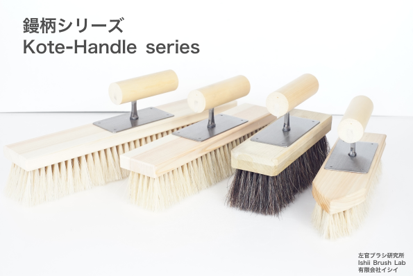 左官ブラシは、用途や職人の手に合わせて、さまざまな形状の柄(ハンドル)があるのが特徴です。